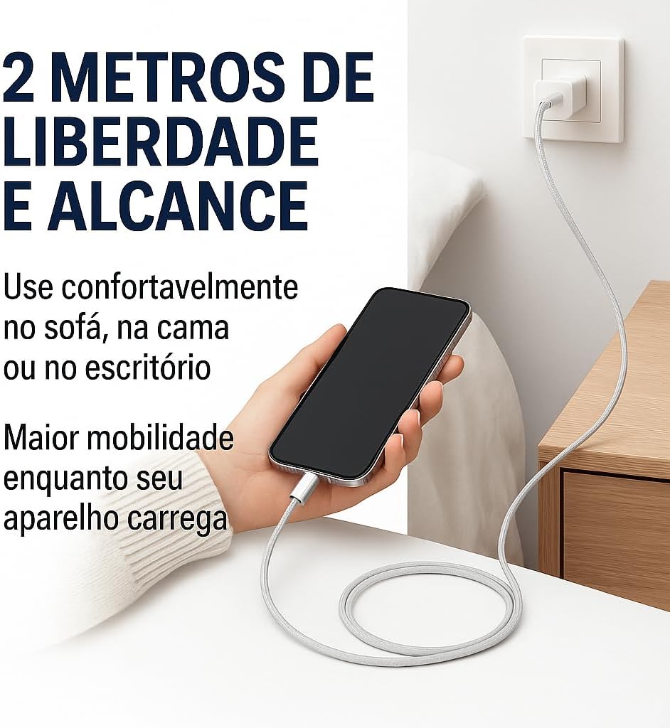 💪 Cabo Revestido em Nylon Trançado Mais resistente que os cabos comuns! O acabamento em tecido trançado aumenta a durabilidade, evita quebras e garante maior proteção contra desgastes diários.