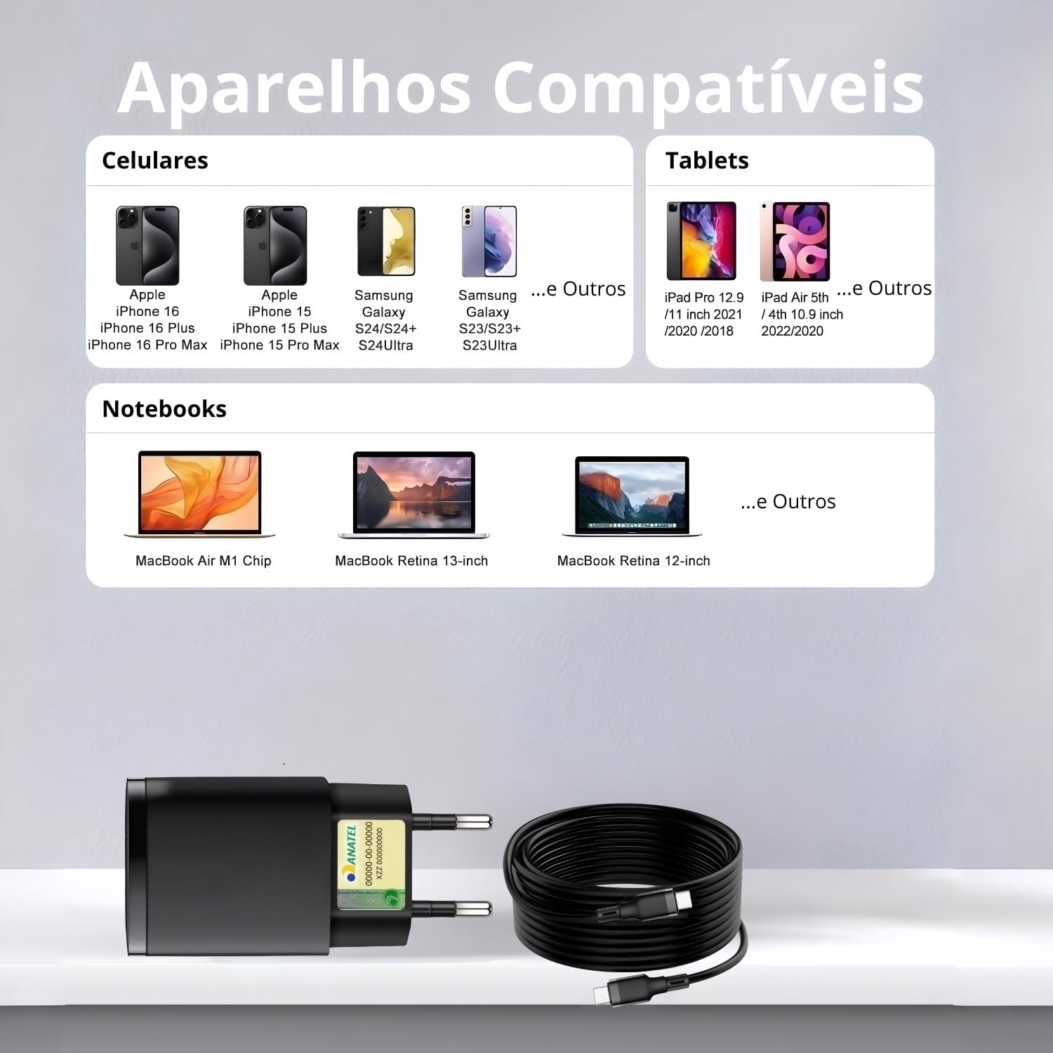 🌍 Compatibilidade Universal: Projetado para ser o carregador ideal para todos os seus dispositivos – compatível com iPhones, iPads, Samsung, LG, Motorola e qualquer aparelho com entrada USB-C. Um único carregador para todas as suas necessidades!