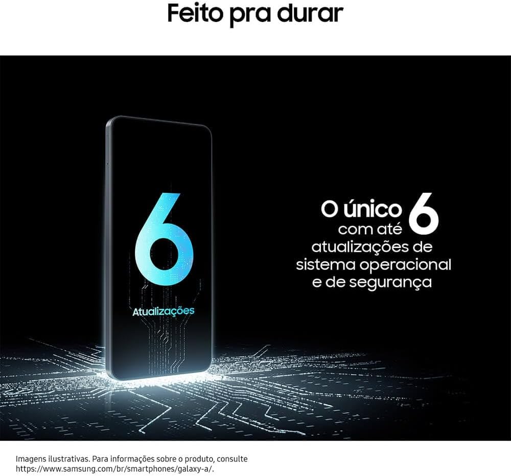 O Galaxy A07 chega para redefinir o que você espera de um smartphone feito para durar, entregando o melhor processador da categoria, câmera dupla de até 50MP, até 6 atualizações de Android e até seis anos de atualizações de segurança, proteção IP54 contra água e poeira, design fino o e recursos que acompanham seu ritmo. Com o processador Mediatek Helio G99 de 6nm e a memória RAM de 4GB + 4GB de RAM Plus (RAM virtual), você roda os seus apps, jogos, vídeos sem travar. O processador tem performance 84% superior a versão anterior (G85). Ainda conta com 128GB de armazenamento para seus vídeos, fotos e apps. Sua câmera dupla de até 50MP é capaz de fazer fotos em alta resolução trabalha em conjunto com uma câmera de profundidade permitindo efeitos incríveis para suas fotos. E com a câmera frontal de 8MP você tira selfies perfeitas. Feito para durar e atualizado por mais tempo, o Galaxy A07 oferece até 6 atualizações de sistema operacional Android e até 6 anos de atualizações de segurança. Além disso, conta com proteção IP54, garantindo resistência à água e poeira. Sua tela ampla de 6,7″, HD+, com vidro temperado reforçado e taxa de atualização de 90 Hz, garante resistência e cores vivas e vibrantes, além de ter uma imersão total em filmes, séries e redes sociais. O seu acabamento sofisticado e fino, com espessura de 7,6mm e apenas 184g traz conforto e ergonomia. Equipado com sua bateria de longa duração de 5000 mAh, o Galaxy A07 te acompanha em todos os cantos e permite que você esteja sempre conectado. Com o aplicativo SmartSwitch você transfere de forma fácil e prática o conteúdo do seu celular anterior (fotos, contatos, eventos do calendário, notas, configurações do dispositivo e muito mais). Sua segurança é aprimorada através do Samsung Knox Vault, garantindo que dados confidenciais e sigilosos, como senhas e pins de desbloqueio, permaneçam seguros.