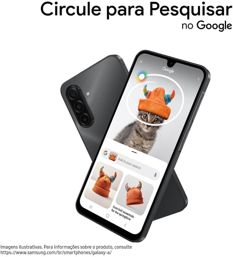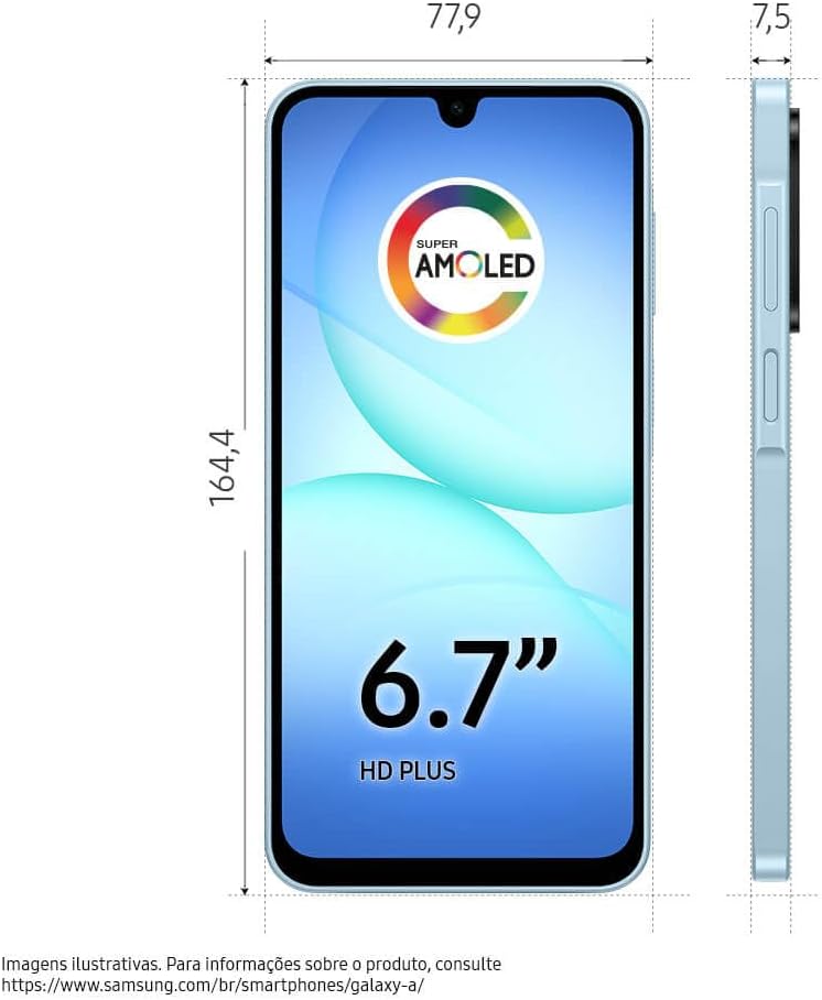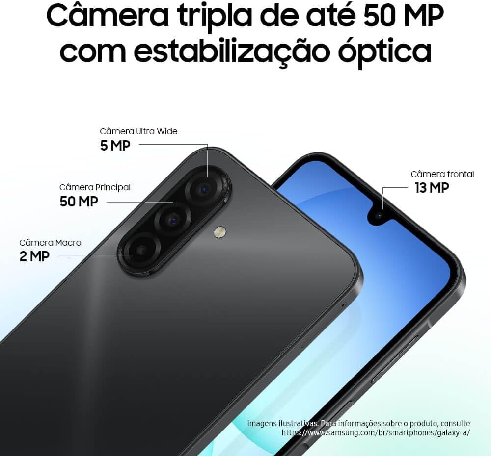Celular Samsung Galaxy A17, com IA integrada, 128GB, 4GB RAM, 4GB RAM Plus, Câmera Tripla Traseira de até 50MP, Câmera Frontal de 13 MP,Tela resistente Super AMOLED de 6.7″, Processador Helio G99 Octa-Core de 6nm, Android 15 com 6 atualizações, IP54 resistencia à água e poeira, NFC, Samsung Wallet, Bateria de 5.000mAh, Dual Chip.