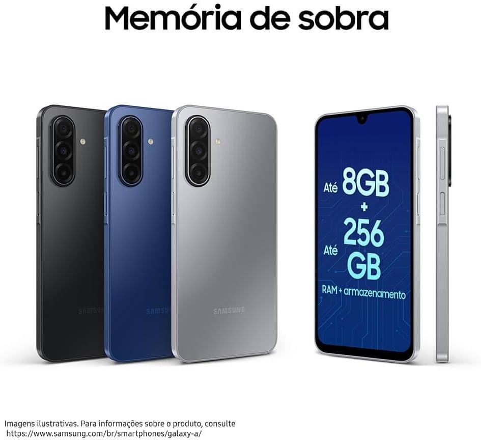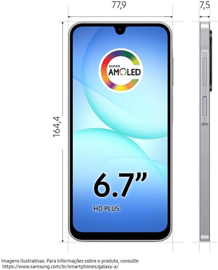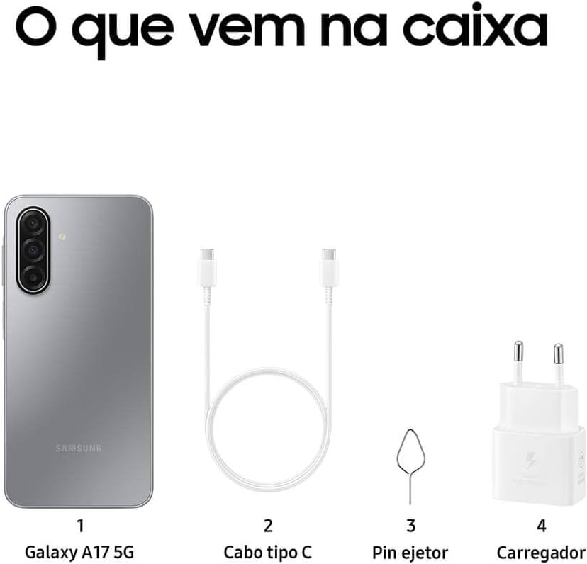 Celular Samsung Galaxy A17 5G, com IA integrada, 256GB, 8GB RAM, 8GB RAM Plus, Câmera Tripla Traseira de até 50MP, Câmera Frontal de 13 MP,Tela resistente Super AMOLED de 6.7″, Processador Exynos 1330 Octa-Core, Android 15 com 6 atualizações, IP54 resistencia à água e poeira, NFC, Samsung Wallet, Bateria de 5.000mAh, Dual Chip.