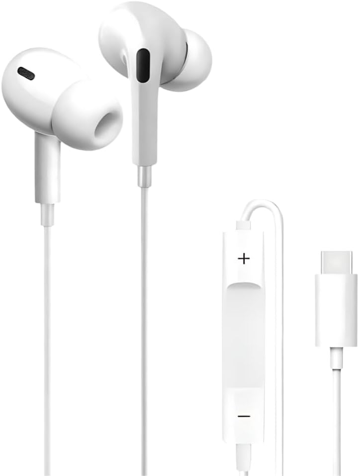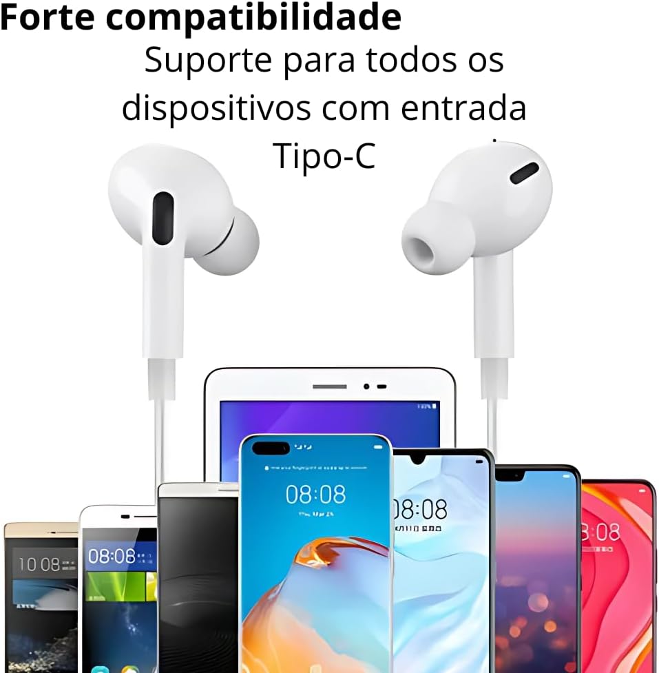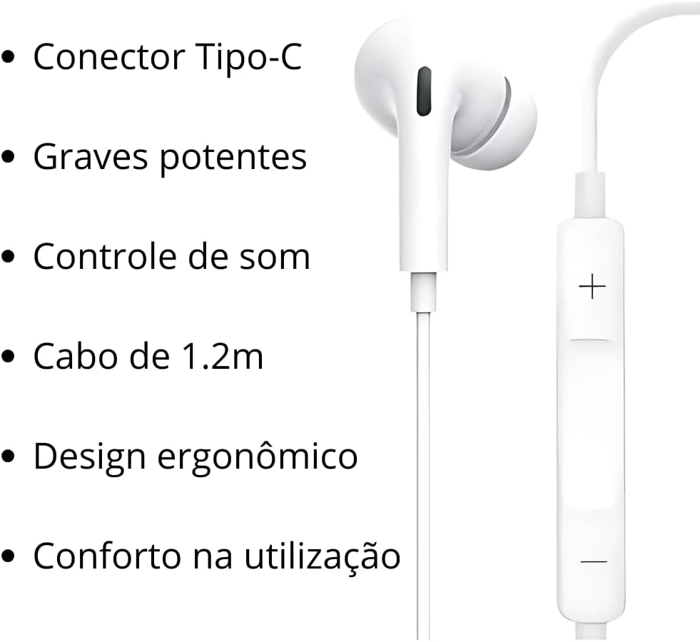 Fone de Ouvido Intra-Auricular USB-C com microfone, Graves Reforçados, Cabo 1,2m, Compatível com iPhone iOS, Samsung Androide, Ideal para Chamadas, Músicas e Vídeos, Cor Branco