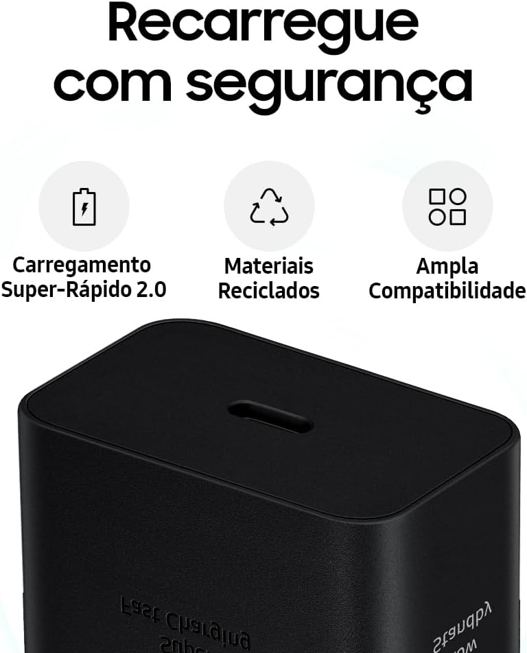 O Carregador de parede Super Rápido 45W tem um formato moderno e compacto. Foi desenvolvido para recarregar a bateria de Notebooks, Tablets e Smartphones, de forma mais rápida e segura. Ele possui a função de Carregamento Super Rápida versão SFC 2.0 / PD 3.0, compatível com modelos da Familia Galaxy S*. Esta função permite recarregar o smartphone em menor tempo, quando comparado com um carregador tradicional. E ao ser conectado a um aparelho não compatível com essa função, o carregamento é normal.