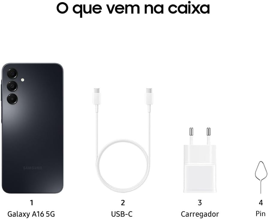 Samsung Celular Galaxy A16, 128GB + 4GB RAM, Câmera de até 50MP, Tela 6.7″, NFC, IP54, Bateria 5000 mAh (Preto)