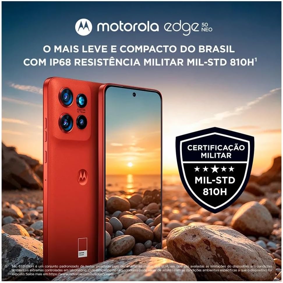 O mais leve e compacto do Brasil com IP681 e resistência militar MIL-STD-810H2. Design extraordinariamente fino, leve e durável com Vegan Leather e cores PANTONE™. O poder da IA pelo sensor Sony – LYTIA™ 700C, zoom óptico e edições mágicas no Google Fotos. Detalhes impressionantes em qualquer luz, com um só clique. Tela de 6,4″ pOLED 1,5K super HD com maior brilho da categoria: 3.000 nits e Smart Water Touch. Veja, edite e compartilhe fotos e vídeos na tela com definição e brilho de cinema. Performance poderosa com moto ai e 16 GB RAM Boost3 para múltiplas tarefas. Otimiza o uso da memória com aprendizado de inteligência artificial Pronto para o dia em 11 minutos4 com TurboPower™ 68 ultrarrápido. Ou com carregador sem fio de até 15 W5. Inovações e atualizações de software. Receba cinco upgrades do Android® e conte com atualizações de segurança até 2029. 256 GB de armazenamento interno6. Conte com muito espaço para fotos, filmes, músicas e apps.